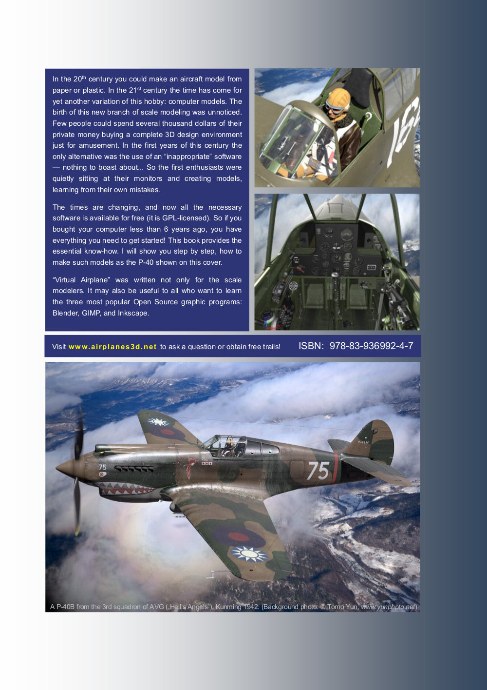 The four volumes of the "Virtual Airplane" series will teach you how to create the model shown on the cover. This guide assumes that you may know nothing about the 3D modeling software, so it starts the course from the very basics. In subsequent chapters the author builds a computer model of the P-40B fighter, gradually introducing new methods and tools. Every step of this workflow is shown in numerous illustrations.